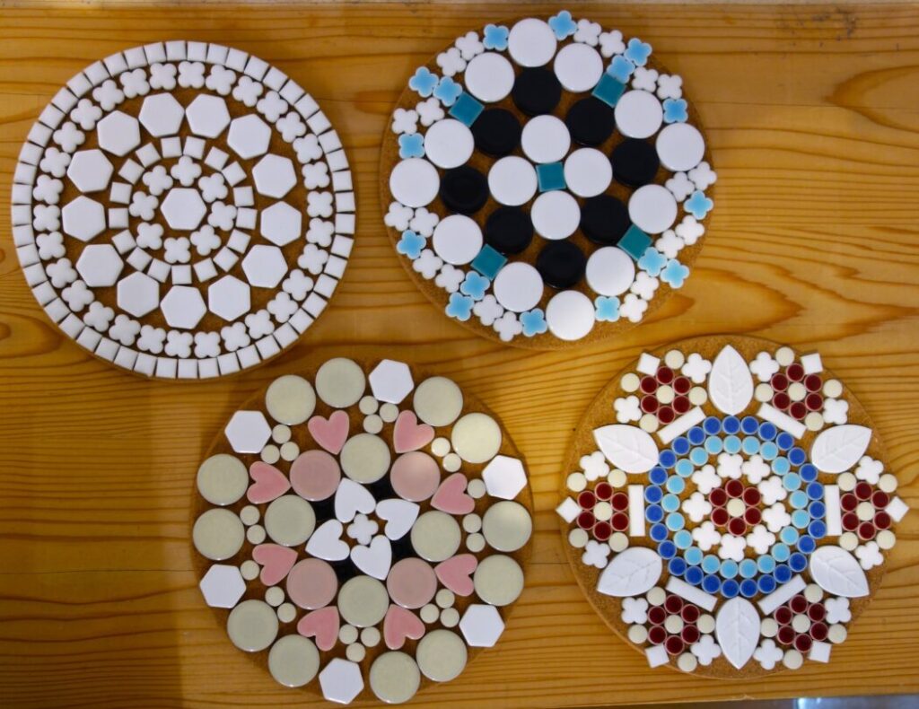 直径19センチ丸い鍋敷きコルクにタイルでアートを組み、木工用ボンドで貼り付けましょう!